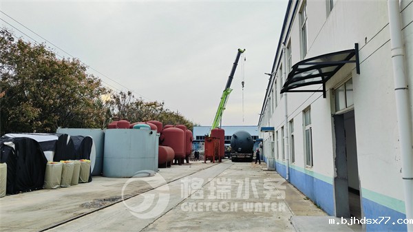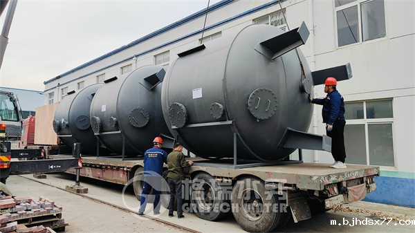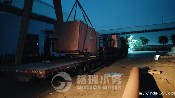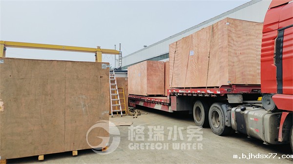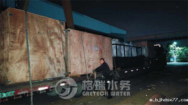 今天发货的设备包括多介质过滤器、刮泥机、板框压滤机、加药装置、风机、电控柜等安装配件。因通过海运运输,设备用木箱进行打包,现场看到工程人员安全有序的操作着行车装车,装卸组人员配合着装车,装车后大车缓缓的驶出厂区发往青岛港口。